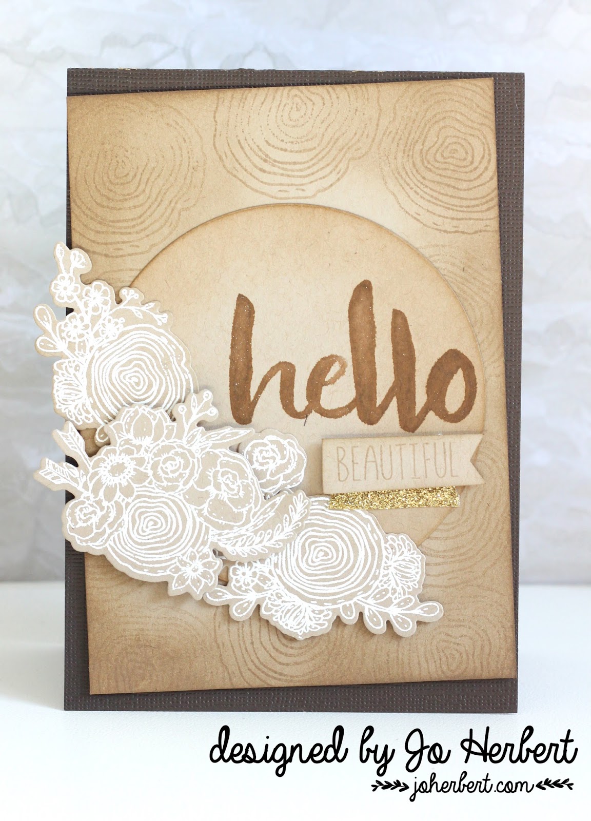 Card 4 - This is card is my favourite. Same techniques as the previous cards but instead if the project life cards I have die cut a circle to stamp the "hello" sentiment in baked brown ink. I have gone over the hello with clear wink of stella. The crumb cake layer has been placed slightly off centre adding some interest to the card.
